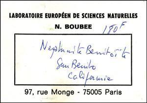 When Ernest Boubée died some time before 1945 the firm was taken over by the grandson, Nérée Boubée II, who renamed the company after himself, "N. Boubée," and greatly expanded the science publishing branch. He died in the 1960s. A label exists (the last one shown here) showing that Nérée Boubée II moved the company to 87, rue Monge (in 1958), and changed the company name (at least temporarily) to "Laboratoire Européen de Sciences Naturelles." The Société Nouvelle des Editions Nérée Boubée still exists today, at the rue Monge address, and also at 9 rue de Savoie, in Paris.