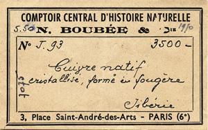 Ernest Boubée, having virtually grown up in the natural history business, billed himself as a "naturalist" and as the successor to the Éloffe Company. He was a meticulous cataloger, and his labels commonly include lengthy inscriptions describing the specimen. By 1937, however, his mineral sales had declined to almost nothing. Most of his personal collection was sold to the Sorbonne. Wanting to clear out his remaining study-grade mineral stock, he made an arrangement with mineral dealer Fred Cassirer for Cassirer to help him sell his remaining minerals to American buyers and split the profits. In that way many Boubée specimens came to the United States.