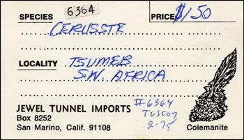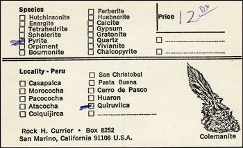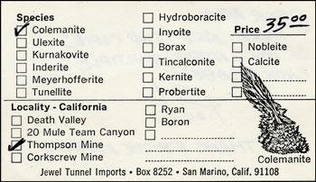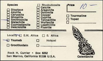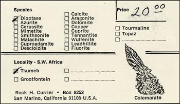 Rock Henry Currier, long-time proprietor of Jewel Tunnel Imports, was born (yes, with that name, a great one for a mineral dealer!) in Evanston, Illinois on August 25, 1940, the son of a physician. Around 1944 his family moved to sunny California, where he lived thereafter, except for four years he spent working for a chemical company and "chasing minerals" in New York.Rock attended Pasadena City College for two years, earning an Associate of Arts degree in 1960, and then spent two more years studying chemistry at UCLA, but dropped out before receiving a degree. His first job was in the U.S. Borax chemical control laboratory at the borate deposit at Boron, California, working under Vince Morgan, whose office contained many shelves filled with well-crystallized examples of the various borate minerals that came from the deposit. After leaving Boron, Rock worked for companies that manufactured chemical reagents for hospital laboratories, until being laid off in 1972—the event which precipitated his entry into the mineral business.