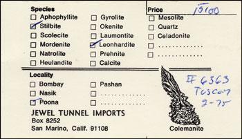 Following his layoff in 1972 he took a trip to India, Fiji, Australia, Malaysia, Thailand and Korea to look for minerals, and the Indian zeolites became a passion with him. There he collected in the quarries and imported tons of zeolites to sell through his new business, "Jewel Tunnel Imports" (the name borrowed from a legendary railway tunnel between Bombay and Poona that cut through fabulous pockets of crystallized zeolites). He shared a room with Gene Schlepp at his first Tucson Show in 1972, selling Indian minerals. Soon his friends were referring to him jokingly as the "Poona pimp." He sold minerals in New York for a short time thereafter, based in the Wildcliff Museum (he had an apartment in New Rochelle, New York), but after four years he left New York and moved back to California, where he ran the business from his mother's house in San Marino.