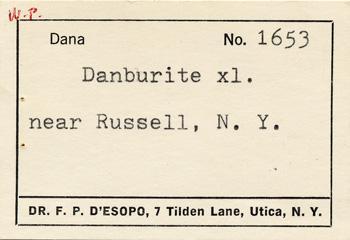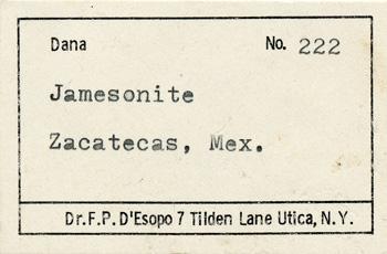 Dr. Ferdinand P. "Fred" D'Esopo was born in Utica, New York, on May 24, 1917, the son of Elizabeth Donato and John D'Esopo, a grocer. Fred had an active dental practice in Utica, New York and was a member of the Lion's Club. He married Theresa Barone in 1970 (she died in 2006).D'Esopo was a good friend of William Pinch, having first met him during a visit with the Utica Club to see Pinch's collection. D'Esopo enlisted Pinch's aid in building a species collection of high-quality specimens, purchasing hundreds of specimens from him. The red "w.p." in the corner of some of D'Esopo's labels refers to specimens he obtained from Pinch. D'Esopo built a collection of about 3,000 specimens, but retired in 1999 due to Parkinson's Disease. He sold off his collection through Pinch before his death, and died in Utica on November 5, 2004.