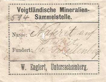 Christian Wilhelm Englert was born in the Leibenstadt community, Adelsheim, Baden-Württemberg, Germany on February 4, 1835, the son of Katharina Bender and Georg Englert. He served as schoolmaster and teacher (Kantor and Oberlehrer) at the Untersachsenberg-Georgenthal parochial school in Untersachsenberg, Saxony. He published ads under the company name of Voigtländische Mineralien-Sammelstelle ("Vogtland Mineral Collection Place") in the journal Deutsche botanische Monatsschrift in 1891, as well as in Insektenbörse in 1889 und 1891, offering coal fossils and also minerals in large, beautiful pieces at 20 Pfennigs apiece. In 1899 the Natural History museum in Vienna acquired from Englert a Schneckenstein topaz crystal via exchange (Annalen des K. K. Naturhistorischen Hofmuseums, vol. 14, 1899). Likewise the University of Oslo, Norway, received a large collection of Saxon topaz specimens in an exchange with Eglert in 1907. Topaz appears to have been one of his specialties, as he also offered 5-kg packages of topaz or sphalerite specimens in exchange for 5 kg of other minerals