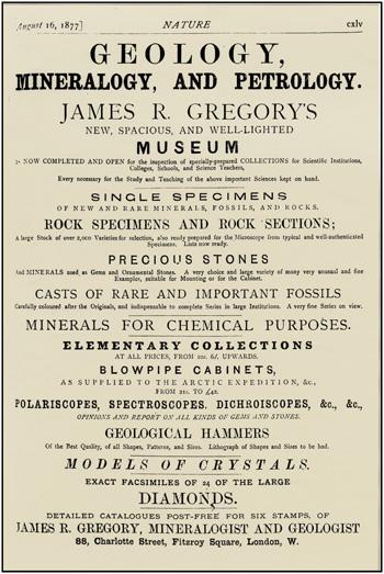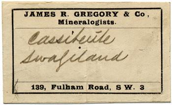 James Reynolds Gregory, one of the principal London mineral dealers in the last half of the 19th century, was born in London on December 29, 1832. The company he founded (today known as Gregory, Bottley & Lloyd) is one of the longest-running mineral specimen dealerships in the world, second only to the F. Krantz Company in Bonn, which was founded about 20 years earlier.Gregory was educated at Archbishop Tennison's School, and afterward found employment first as an assistant in a silk and jewellery company on Regent Street. In 1858, at the age of 26, he established a business of his own selling minerals and fossils from quarters in King William Street. A few years later he moved to "very extensive premises" in Golden Square. He soon gained a reputation as one of the best dealers in the city, exhibiting at many of the major commercial shows in London and elsewhere, and winning awards for the excellence of his specimens (in Paris, 1867; Sydney, 1879; London, 1862, 1883 and 1884).