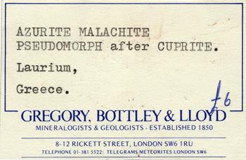 Following Percy Bottley's death in 1981 the business was sold to Brian Lloyd, (whereupon it became Gregory, Bottley & Lloyd), who was previously a mineral dealer for seven years in Pall Mall. He has carried on the company's specialization in historic collections, most recently that of Robert Ferguson (1767-1840). Brian moved the business to 12-13 Rickett Street in London in 1982 and in April 1993 to 13 Seagrave Road, London, where it continues today.