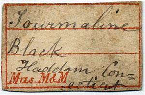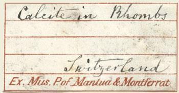 The mineral labels with red “Ex. Mus. P[rince] of Mantua & Monferrat” and smaller ones reading just “Mus. M. & M.” were said to have been written by a relative of his who became Prince of Mantua and Montferrat. This, as with much of his history, is questionable.