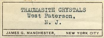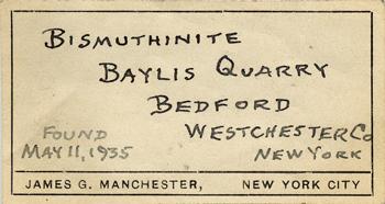 James Greenfield Manchester was born in Fall River, Massachusetts on September 20, 1871. He was "a man whose love of fine mineral specimens found expression in a lifetime of devoted service to his fellow collectors and enthusiasts." As a young man he began collecting minerals around 1892. He also studied typing, and created artworks composed of typewritten characters which won the highest award at the Columbian Exposition in 1893. Manchester married Florence Pilkington (1873-1919) in Fall River around 1895 and they had a son, James Jr., in 1896; he died in 1943, sadly predeceasing his father, but gave him a grandson, James G. Manchester III, that same year. Manchester moved with his wife and son to New York City between 1897 and 1900 to serve as Treasurer of the Manhattan Church of the Ascension, then took a position as Assistant Treasurer of the New York Mutual Life Insurance Company (by 1910) and Treasurer (by 1920); by 1930 he had been appointed Assistant Manager of their real estate division.Manchester was an enthusiastic and generous mineral collector, with an eye for high-quality specimens. He often bestowed choice specimens or suites on his friends and acquaintances, on promising young collectors, and on many eastern mineralogical museums including the American Museum of Natural History in New York. He was a frequent lecturer on the joys of mineral collecting before mineral clubs and high school and Boy Scouts groups. In 1921, still grieving from the death of his beloved wife in 1919, Manchester donated a collection of 3,000 specimens in six sloping-top glass cases to the Public Library in their hometown of Fall River; he had it dedicated in his late wife's memory, as the "Florence Pilkington Manchester Memorial Collection." In 1923 he remarried, to Mrs. Clara A. Ehmer.