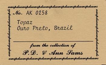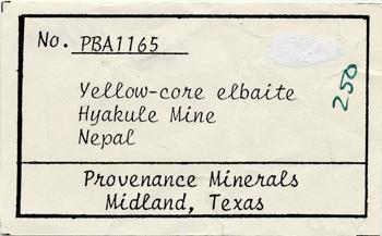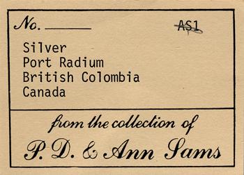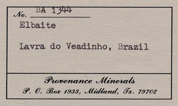 Label for a Perkins Sams specimens sold off for him by Paul Desautels under the company name “Provenance Minerals”