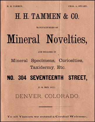 Harry Heye Tammen was born in Baltimore, Maryland on March 6, 1856, the son of a German immigrant pharmacist. He attended Knapps Academy in Baltimore, then worked in Philadelphia before moving to Denver in 1880. With his partner Charles A. Stuart he worked as a Denver bartender in 1880, and in 1881 they established the firm of H.H. Tammen & Co. (which in 1896 became the H.H. Tammen Curio Co., with partners Carl Litzenberger and Joseph Cox ) in Denver, Colorado. Deeply interested in the study of mineralogy, he published a promotional journal called Western Echoes magazine, "Devoted to Mineralogy, Natural History, Botany, &c. &c." Volume 1 number 1 is copyrighted 1882.Tammen sold mineral specimens and mineral collections, some of which must have been quite fine. His "native silver in elongated octahedrons and arborescent forms, from the Stonewall Jackson mine, McMillanville, Arizona" (specimens priced up to an expensive $40), for example, would be highly prized today. He offered Pikes Peak amazonite specimens ("we can at all times furnish them") priced up to $20, "the high-priced ones are, of course, comparatively very large and of considerable weight, including twin crystals and large groups of same, and are suitable for State or National museums or other large collections." His selection of fine Colorado telluride minerals included petzite, , sylvanite, coloradoite, altaite, calaverite, hessite, and native tellurium.