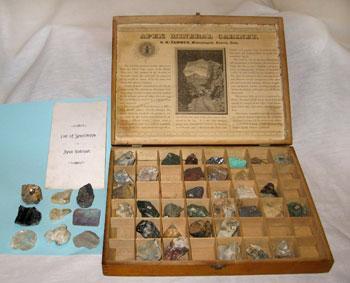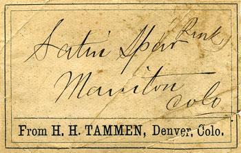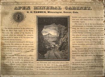 Tammen also manufactured a very popular line of "Colorado curiosities" and "mineral novelties" consusting of a variety of numbered and identified Colorado mineral and ore specimens cemented onto clocks, caskets, inkstands (one of which won an award at the 1881 Colorado State Fair), centerpieces, crosses, horseshoes and so on for ornamental purposes. He described these items as "perfect in taste, blending of colors, etc., and absolutely trustworthy as regards the cataloguing, classification and specifications of the different minerals employed in the construction of each article." He also dealt in stereoscopic and other photos of the West (he was supplied by the famous Western photographer W.H. Jackson), photo albums, books on the West, silver souvenir spoons, a wide variety of humorous and scenic postcards (especially of mining areas), fossil fish, polished agates, botanical specimens, Pueblo Indian pottery, Tlingit Indian carvings, relics and taxidermy items from his stores in Denver.
