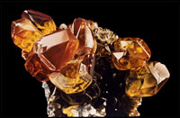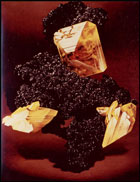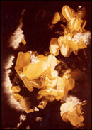 Oil on canvasboard, 16 x 20 inches (1974). Painted from a thumbnail specimen of yellow wulfenite crystals with red centers, unique to the 79 mine in Arizona. Current specimen owner: unknown. Painting: Don Olson collection. Copyright 1974 Wendell E. Wilson.
