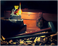In addition to collecting minerals, Wilson has built substantial collections of mining artifacts of all kinds, and published four books on antique miners' lamps, containing hundreds of hand-drawn pen-and-ink illustrations of miners' oil-wick “frog” lamps, candleholders, and carbide cap lamps. Some of his collectibles appear as props in his paintings of underground scenes. His first mineral painting appeared on the cover of the November-December 1972 issue of Mineralogical Record. His series of fantasy mineral-collecting scenes now numbers 14, and he has produced numerous specimen portraits in oil on canvas, watercolor, India ink and mixed media, as well as a number of highly detailed mining still life paintings in oil on canvas, oil on copper, and India ink.