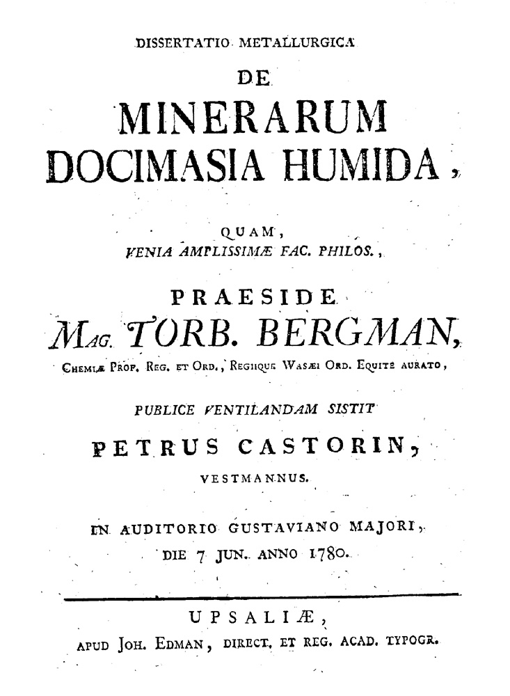 Dissertatio Metallurgica | De | Minerarum | Docimasia Humida, | Quam, | Venia Amplissimæ Fac. Philos., | Praeside | Mag. Torb. Bergman, | Chemiæ Prof. Reg. et Ord., Regiiqus Wasæi Ord. Equite Aurato, | Publice Ventilandam Sistit | Petrus Castorin, | Vestmannus. | In Auditorio Gustaviano Majori, | Die 7 Jun. Anno 1780. | [rule] | Upsaliæ, | apud Joh. Edman, direct. et reg. acad. typogr.