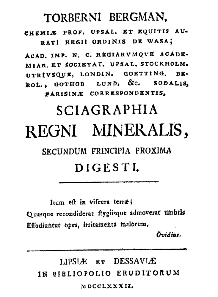 Torberni Bergman, | [...7 lines of titles and memberships...] | Sciagraphia | Regni Mineralis, | Secundum Principia Proxima | Digesti. | [rule] | [...3 lines of quotation in Latin, signed Ovidius...] | [rule] | Lipsiæ et Dessaviæ | In Bibliopolio Eruditorum | MDCCLXXXII.