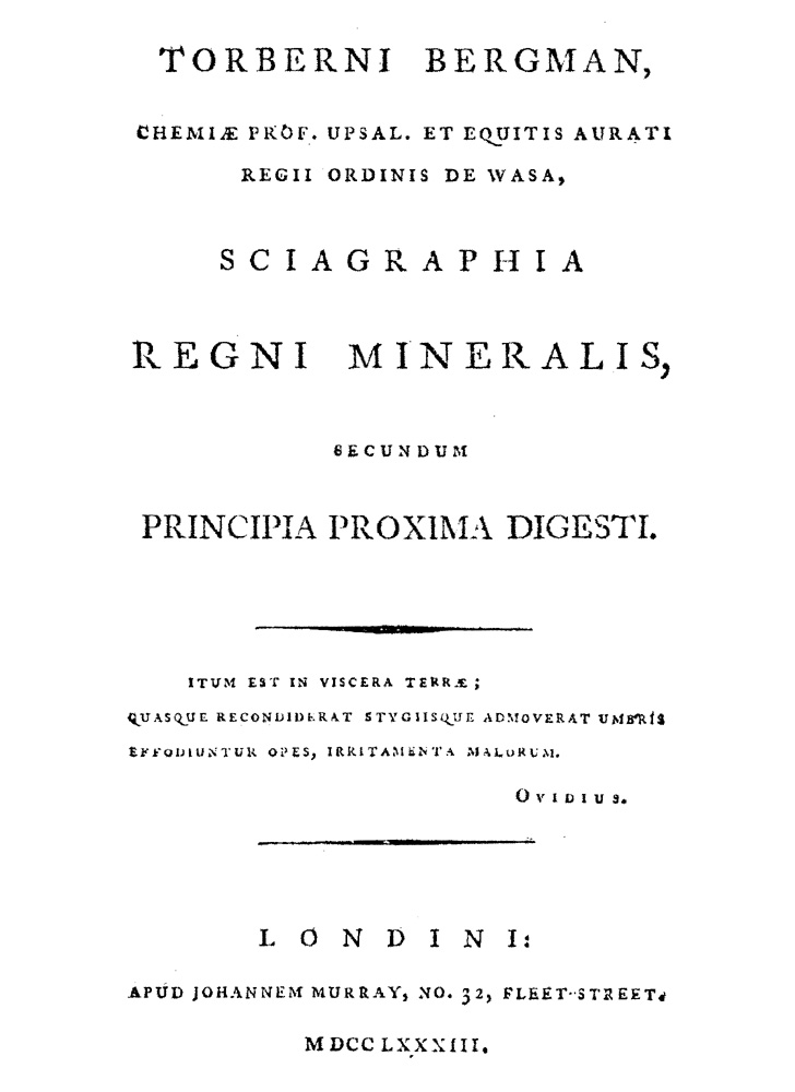 Torberni | Bergman, | Chemiæ Prof. Upsal. Et Equitis Aurti | Regii Ordinis De Wasa, | Sciagraphia | Regni Mineralis, | Secundum | Principia Proxima Digesti. | [tapered rule] | [...3 lines of quotation, signed Ovidius...] | [tapered rule] | Londini: | Apud Johannem Murray, No. 32, Fleet-Street. | MDCCLXXXIII.