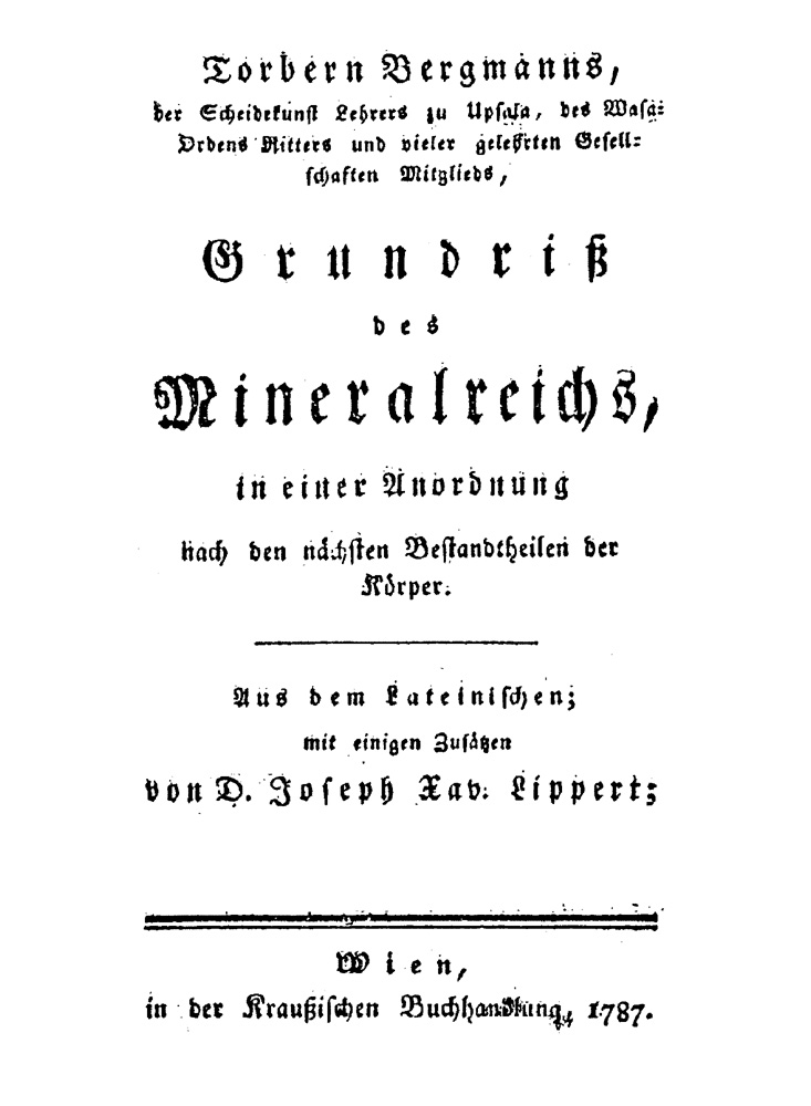"In answer to the request of my very good friend, Mr. Ferber, I sent him a small outline of mineralogy in which the minerals were arranged according to their con stituent elements. After looking it over, he asked my permission to publish it. At first I thought it would be better not to publish a work so imperfect, especially considering the number of analyses which remained to be made. Mr. Ferber replied that a perfect method was not yet to be expected in so extensive a field, but that having once laid a foundation I might occasionally make such additions and corrections, in new editions of the work, as future experiments might make necessary. Indeed I was fully aware that the system would be perfected more quickly if submitted to the inspection of other more discerning Chemists, than if its completion depended solely on me. The different remarks of others will correct errors, which by further work I might have corrected, but if science is advanced, it does not matter by whom. So Genera and Species are given, except in the Appendices which, since they did not properly belong in my outline, contain Genera only. The Genera are based on the principle elements, and the Species on the remaining components. Varieties depend upon external appearances, and are therefore omitted here."